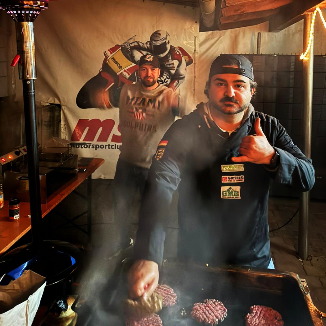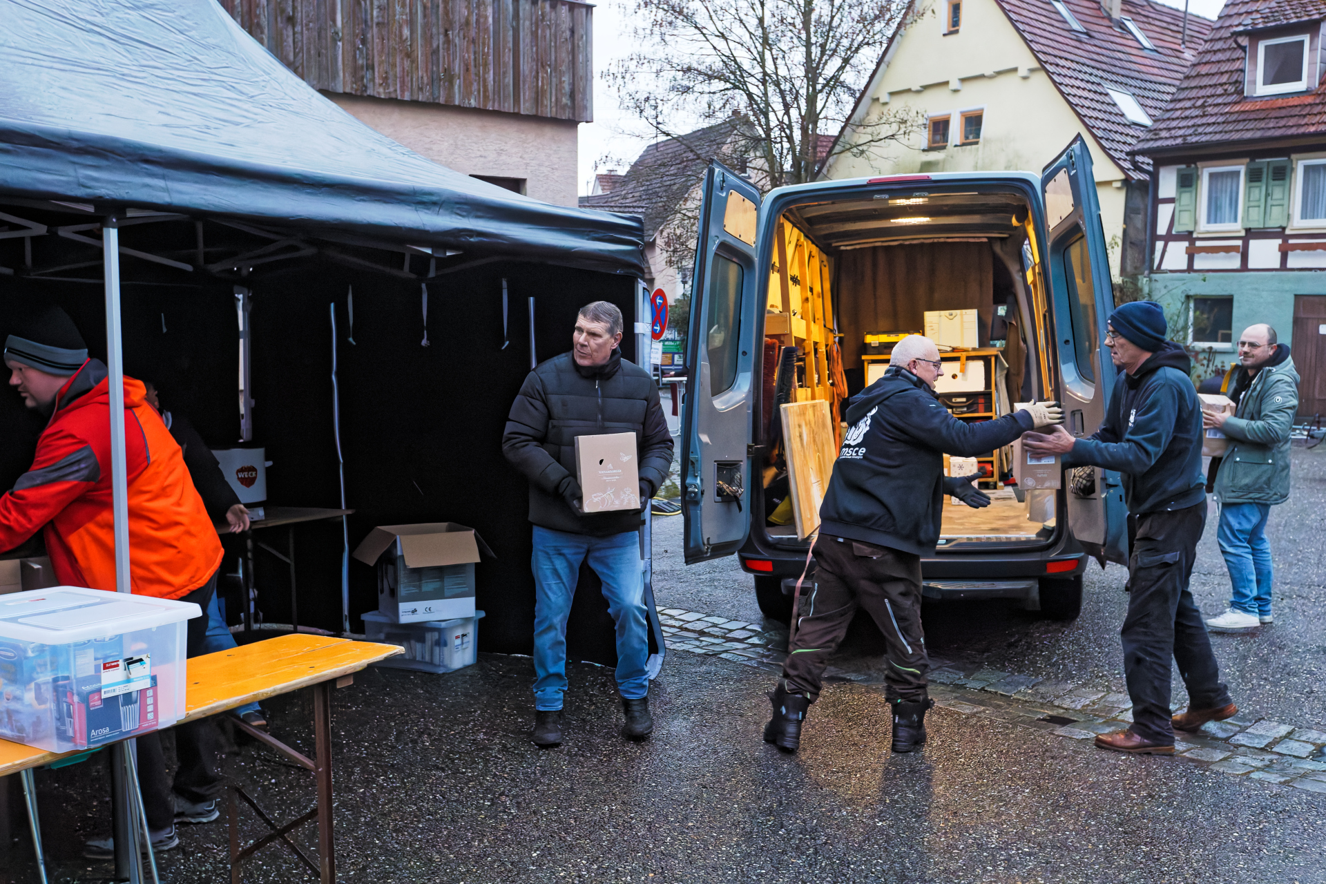 Ensingen – Es ist Sonntagmorgen, der 7. Dezember 2025. Um halb acht Uhr in der Frühe, fast noch bei Finsternis, treffen sich einige Leute auf dem Platz vor der St.-Veits-Kirche in der Ensinger Dorfmitte. Nicht, um sich gemeinsam auf den Besuch des Gottesdienstes vorzubereiten. Sie haben den Transporter mit der Aufschrift »Schreinerei Stierle« erwartet, der gerade vorfährt, vollbeladen mit Pavillon-Zelten, Tischen, einer Spüle und so weiter – eben dem Material, das der Motorsportclub Ensingen (msce) für den Aufbau des Standes benötigt, mit dem er sich seit vielen Jahren am Ensinger Weihnachtsmarkt beteiligt. Ruhig und routiniert wird ausgeladen, aufgebaut und eingerichtet, um gegen elf Uhr, nach der offiziellen Eröffnung des Markts für die Gäste bereit zu sein.
