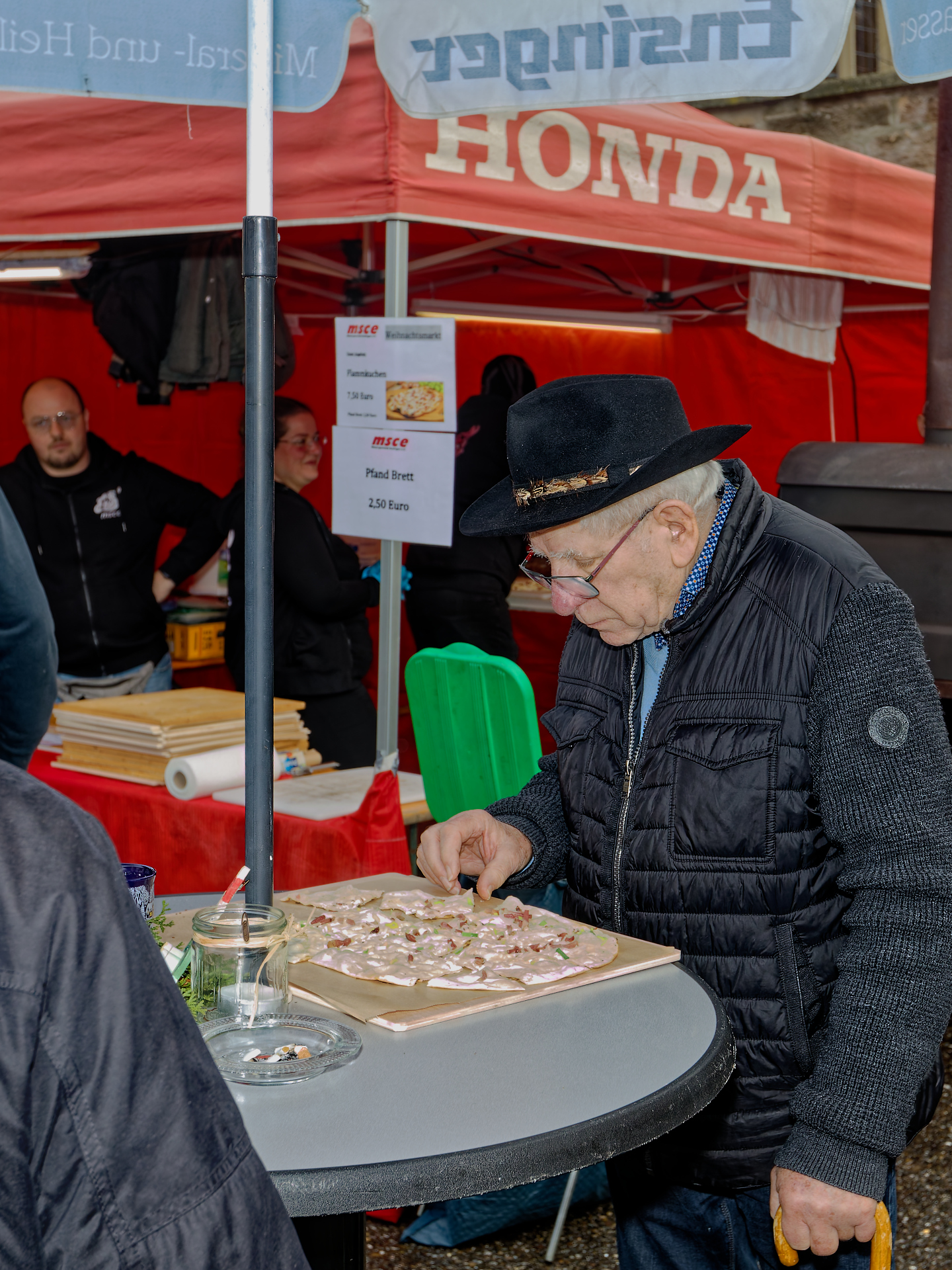 Elf Uhr vormittags: der Ensinger Weihnachtsmarkt ist eröffnet. Die Besucher inspizieren die Verkaufsstände, dann gönnen sie sich eine Stärkung und etwas zu Aufwärmen. Das msce-Angebot ist beliebt – wenig verwunderlich, handelt es sich doch nicht um lediglich warmgemachte Fertigware, sondern um liebevoll zubereitete Spezialitäten. Der Flammkuchenboden wird am Stand nach Belieben belegt, standardmäßig mit Creme-Fraiche, Zwiebeln, Speck, Frühlingszwiebeln und Käse. Auf Wunsch werden einzelne Zutaten weggelassen oder auch reduziert. »Es gibt alle möglichen Varianten«, grinst Udo Tschugg, »außer vegan.« 180 Stück werden bis zum Abend verkauft sein. Der Kirsch-Glühwein läuft nicht ganz so gut wie in den Vorjahren: »Wir haben dieses Mal 17 Kartons gebraucht«, sagt Tschugg, »bisher sind wir immer 20 Kisten losgeworden.« Vielleicht muss die etwas ungenaue Bezeichnung des gereichten Getränks überdacht werden. Denn es handelt sich nicht um einfachen Glühwein mit Kirschgeschmack, sondern um heißen Katlenburger Kirschwein, verfeinert mit Amaretto, Schattenmorellen und einem Sahnehäubchen. Der Laden läuft.