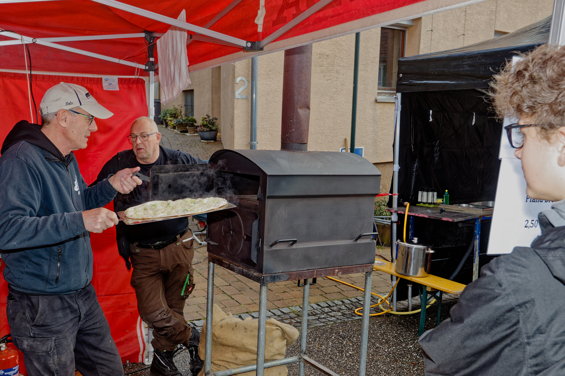 ENSINGEN – Schon seit mehr als zehn Jahren bietet der msce beim traditionellen Weihnachtsmarkt in der Ensinger Ortsmitte seinen auf dem Holzfeuer frisch gebackenen Flammkuchen an. Und auch in diese Jahr konnte Vereinschef Udo Tschugg keinen Grund dafür erkennen, daran etwas zu ändern: »Punkt 18 Uhr hatten wir insgesamt 180 Flammkuchen über unseren Tresen geschoben, damit waren wir ausverkauft«, freute er sich über den Erfolg des msce-Angebots. Auch nebenan, an der Getränke-Theke des Motorradclubs, gab es großen Andrang: der dort mit Amaretto und Sahne getunte Kirschglühwein war offensichtlich ganz nach dem Geschmack der Gäste an diesem schönen, aber kalten Tag.