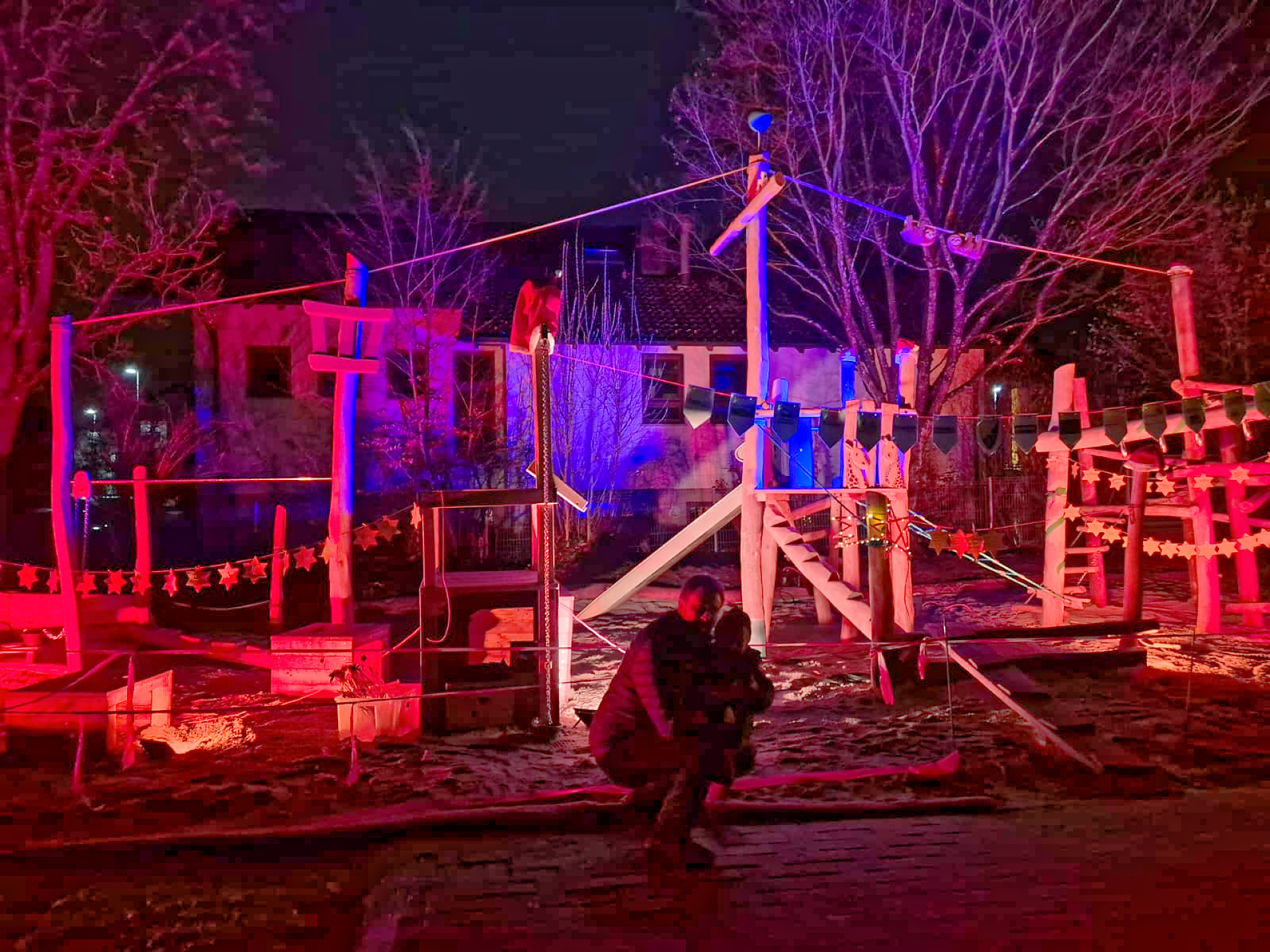 Einen weiteren Samstag dauerte es, bis 22 Fundamentlöcher gebohrt waren, danach konnten die Kinder beobachten, wie die Firma Starkholz zunächst viele Baumstämme anlieferte und mit dem Aufbau der »Arche« begann. Drei Wochen nahmen die Hochbauarbeiten in Anspruch, dann musste das Gelände rund um das Spielgerät nur noch mit 93 Tonnen Sand aufgefüllt werden – fertig.